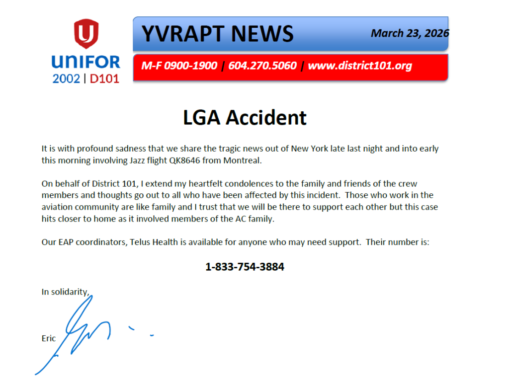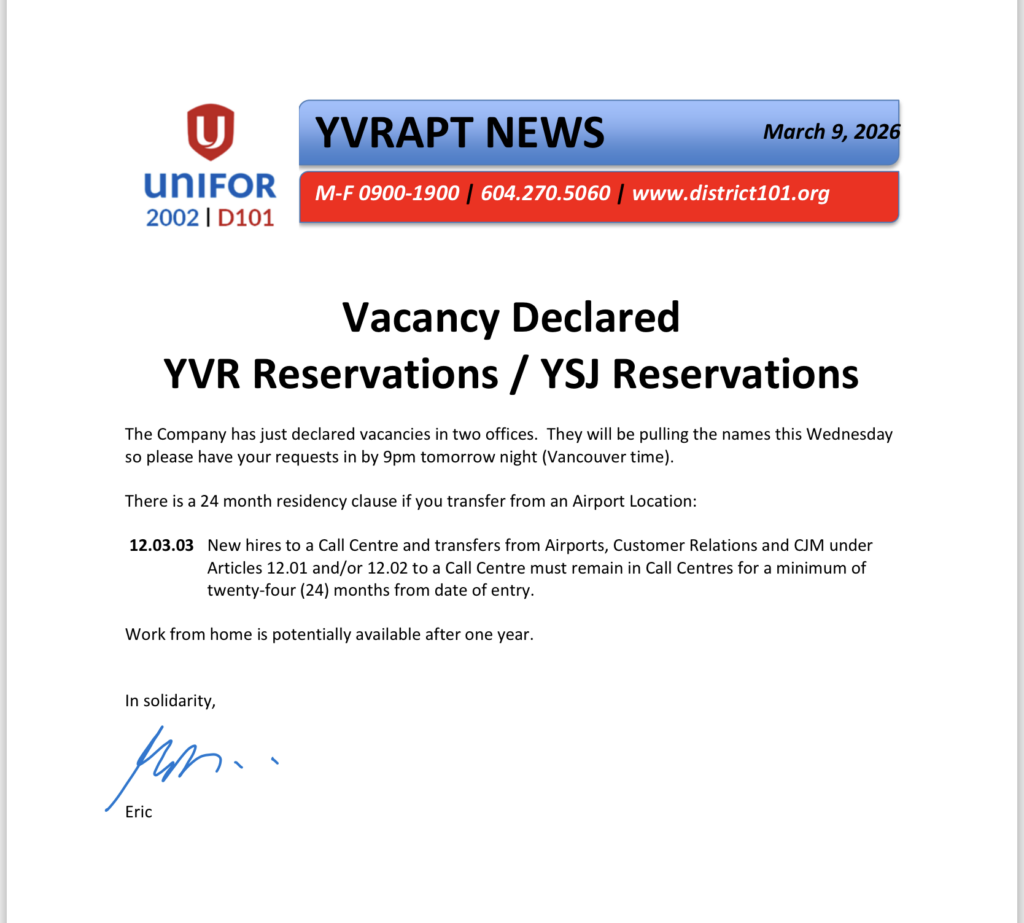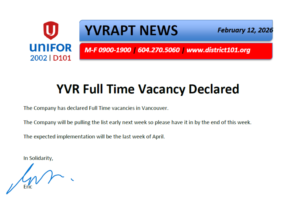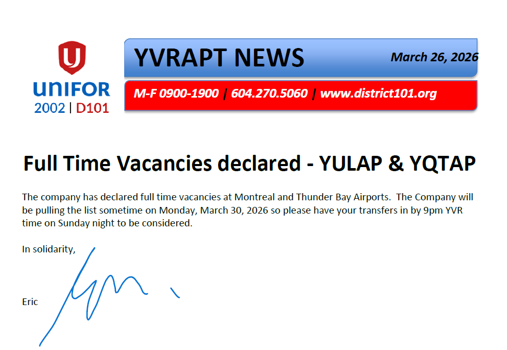 I received the following from Tammy Moore, Unifor 2002 President who came to YVR to meet with myself and some members: